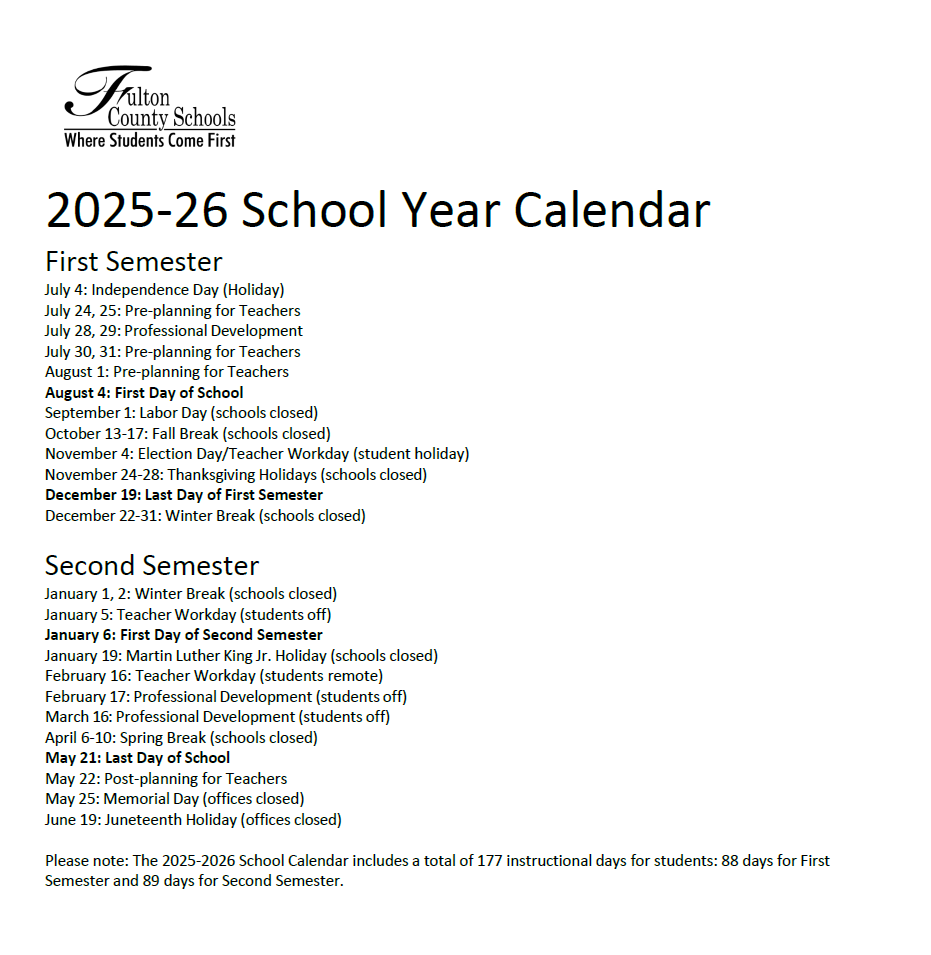 Unless otherwise noted, we follow the Fulton County School Schedule for holidays, breaks, and school closures. Any additional news, scheduling, or other important information will be communicated here, or directly to parents/guardians.